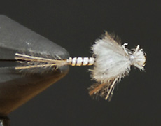ウィングのカラーを若干明るめにし、羽化中の水生昆虫の羽をCDCでリアルに再現してあります。水面直下のライズに対して絶大な威力を発揮し、解禁当初は言うまでもなく、盛期において正体不明のライズがある場合にも頼りになるフライです。ティペットとの結束部分を水に馴染ませておくと、マイクロドラッグを回避できます。